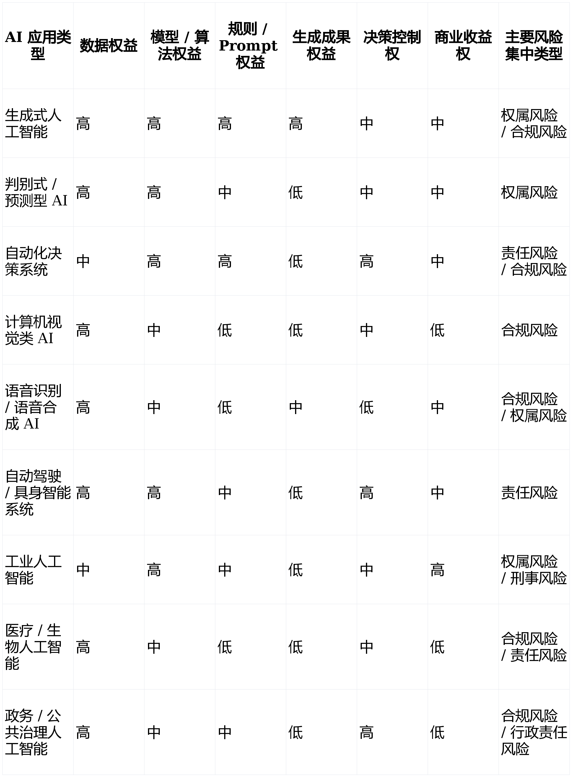 1.表中“高 / 中 / 低”用于反映正在该类 AI 使用场景中,响应权益要素的主要程度及风险集中程度,前往搜狐,用以曲不雅反映分歧人工智能使用类型下,企业可否无效?正在人工智能成长的晚期阶段,各类权益要素的主要程度及风险集中标的目的。权益内容: - 数据调集节制取利用权益 - 模子取生成机制的手艺权益 - Prompt 取法则的贸易奥秘权益 - AI 生成的权属取操纵权益分歧使用类型正在手艺布局、风险体例及权益构成径上具有显著差别,2.“次要风险集中类型”系连系当前监管趋向、司法实践及财产使用环境,